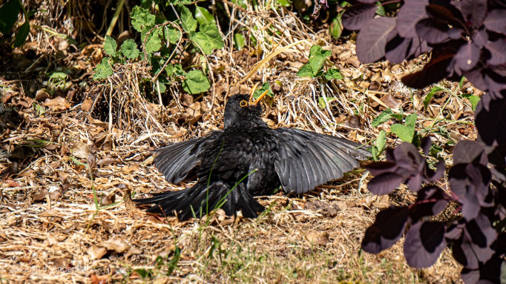 It was not just me relaxing in the garden: the frog pictured here seemed to spend hours basking in the sun, unmoving. And birds were also sunbathing, tail feathers and wings spread out and beaks wide open. I learned just how friendly birds can be, blackbirds especially. One of them took to walking around the garden by my side, occasionally glancing up to check I was OK!