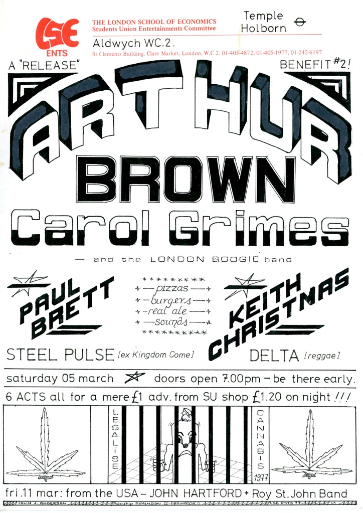 Shown below are four examples of ‘handouts’ – or flyers – for some of the gigs listed. Click on an image to view full-screen. The Release Benefit went very well indeed; needless to say Arthur Brown was great entertainment. I really enjoyed Carol Grimes and the London Boogie Band – desperately underrated at the time and seemingly almost unknown now, which is a great shame. Steel Pulse had not been around for very long, at least outside of Birmingham, and were one of my favourites. They had not yet released a record, but Handsworth Revolution was recorded in 1977 and released in 1978.