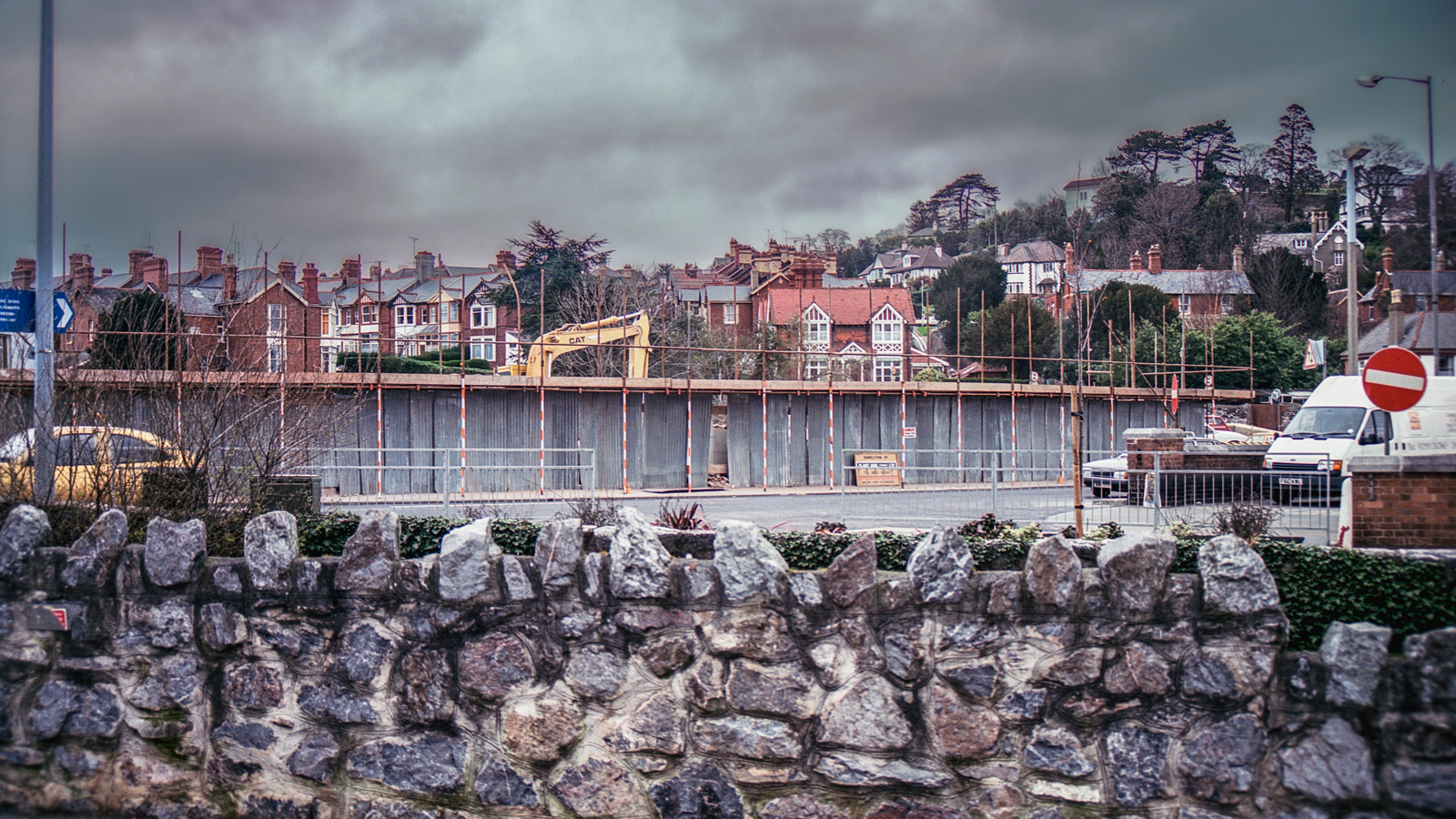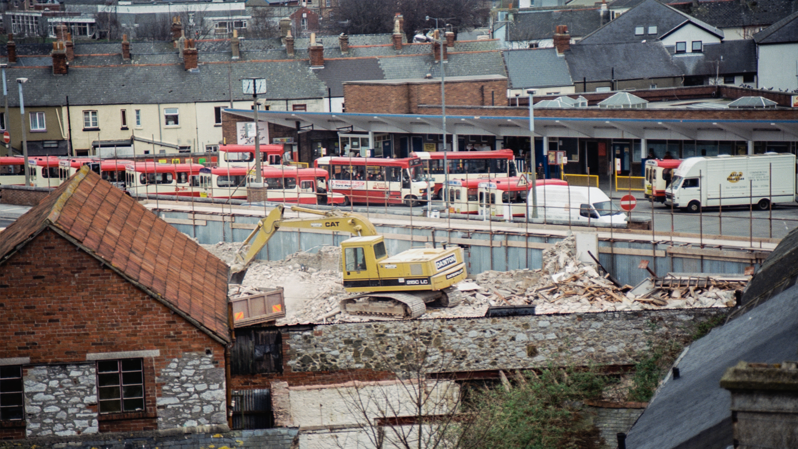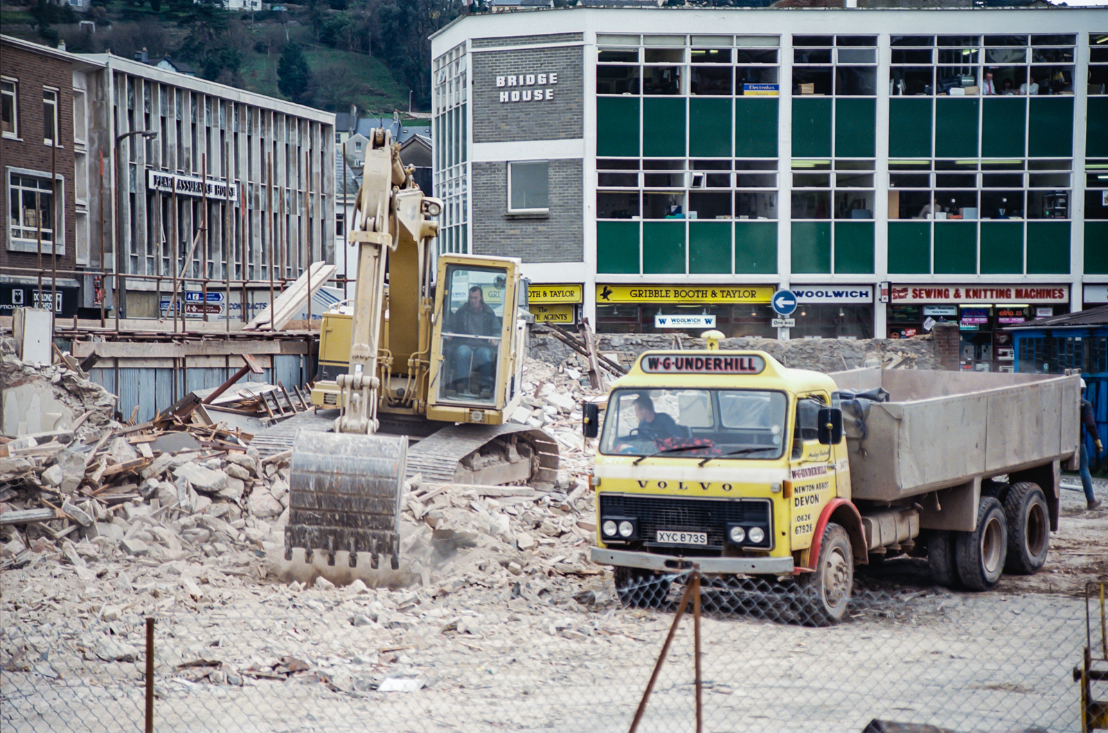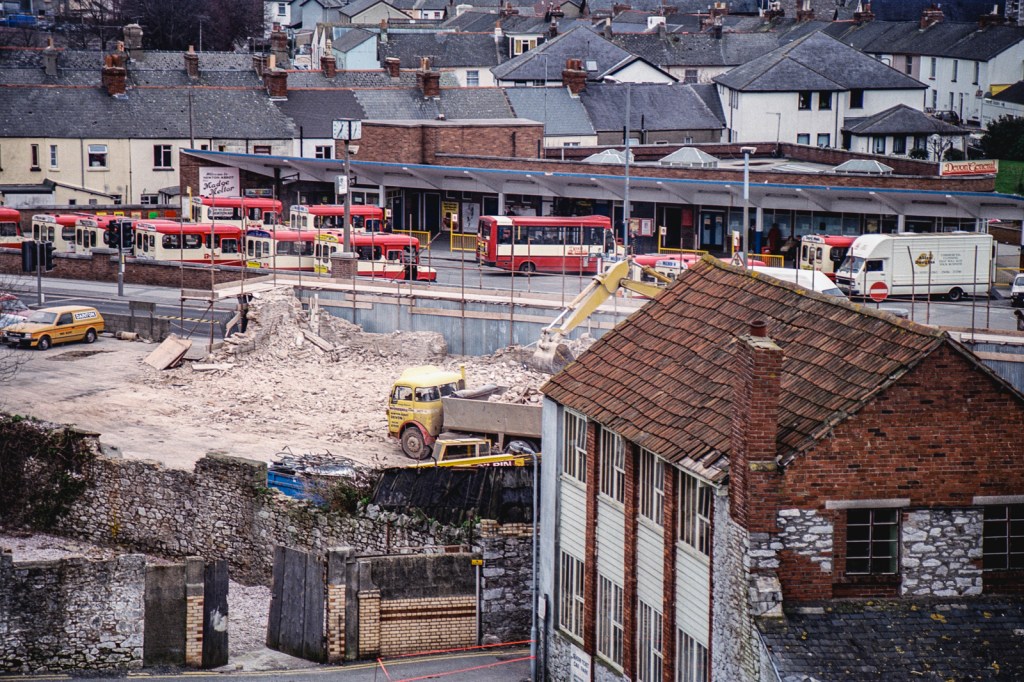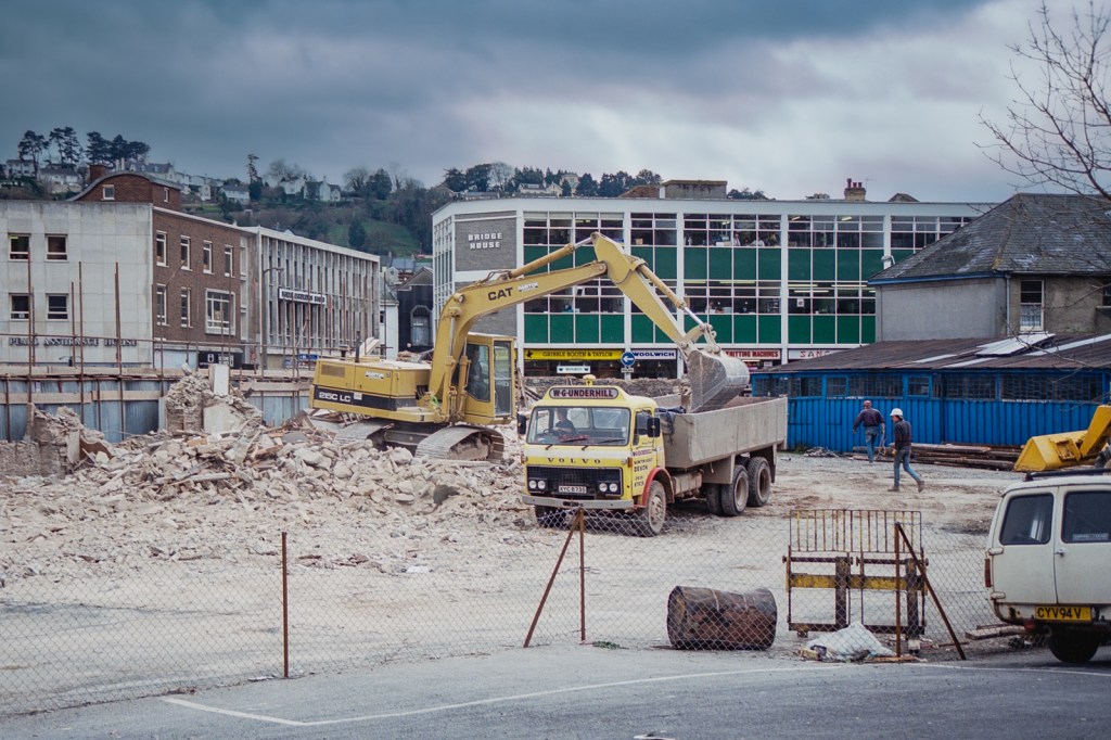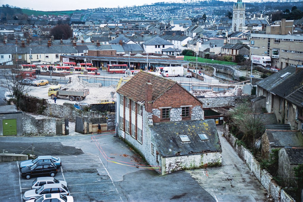 The row of shops and houses opposite the bus station was in the process of being demolished, at one time to make way for the second half of the multi-storey car park that was never actually built. Yes, Newton Abbot has half a car park! The land became a temporary car park but has remained a fixture to the present day (2024). At some point in the (hopefully distant) future it is likely to be a 5-storey hotel. Marvellous.