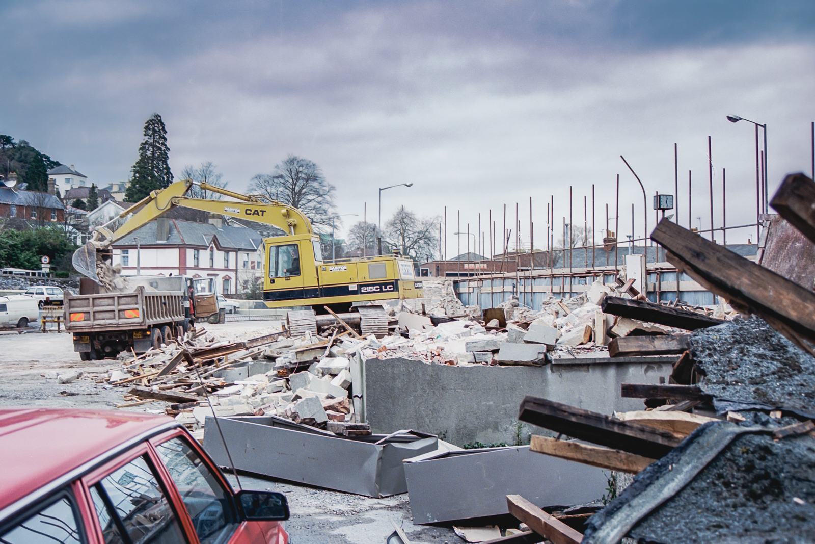 Newton Abbot 1990: the Great Storm takes down the biggest tree in Courtenay Park, whilst demolition takes down shops and other buildings opposite the (old) bus station