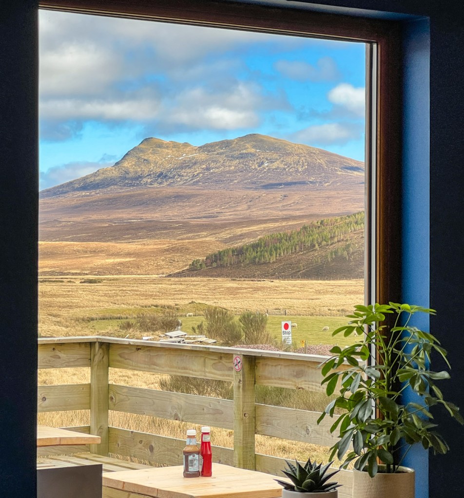 I can heartily recommend The Midge Bite. I know what you are thinking: the sun has zapped my head and I have lost the plot. Who in their right mind would recommend midge bites I hear you scream. I haven’t lost it, this is an amusingly named magnificent cafe in the middle of nowhere – actually Achnasheen – that served excellent coffee and very nice cakes and pastries. The whole place is tasteful and stylish and a very pleasant place to rest for as long as you need. Just look at the view from the window!