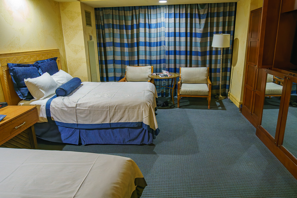 Three times in Vegas since the 90’s and three different hotels. The Luxor is pretty damned good, if slightly frayed at the edges. It’s a spectacular building inside and out – and the hotel rooms are comfortable; I’d give it four stars. The rooms are spacious, clean and comfortable, but slightly underwhelming compared to the overall architecture.
