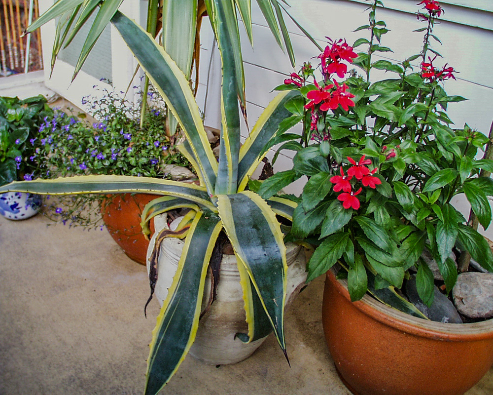 I had more luck with hanging baskets and was particularly taken with a tree-like shrub – Rhus – which had bright red leaves for much of the year. Perhaps surprisingly, the agave pictured above survived for many years, and in fact I brought it down to Devon with me when I moved in 2004.