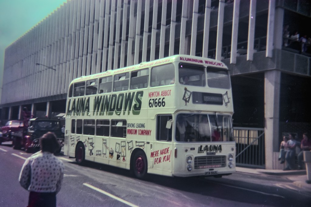 Returning to the 1977 Carnival, here is another photograph that may be of interest. Not a fire appliance but a bus! In this case a Devon General bus that was completely covered in an advertisement for another of Newton Abbot’s major employers – Launa Windows. The bus is seen passing the multi-storey car park looking, in my view, better than it does now. It is on Sherborne Road, which is now a bus stand, and nowhere near as effective or useful as the bus station of old.